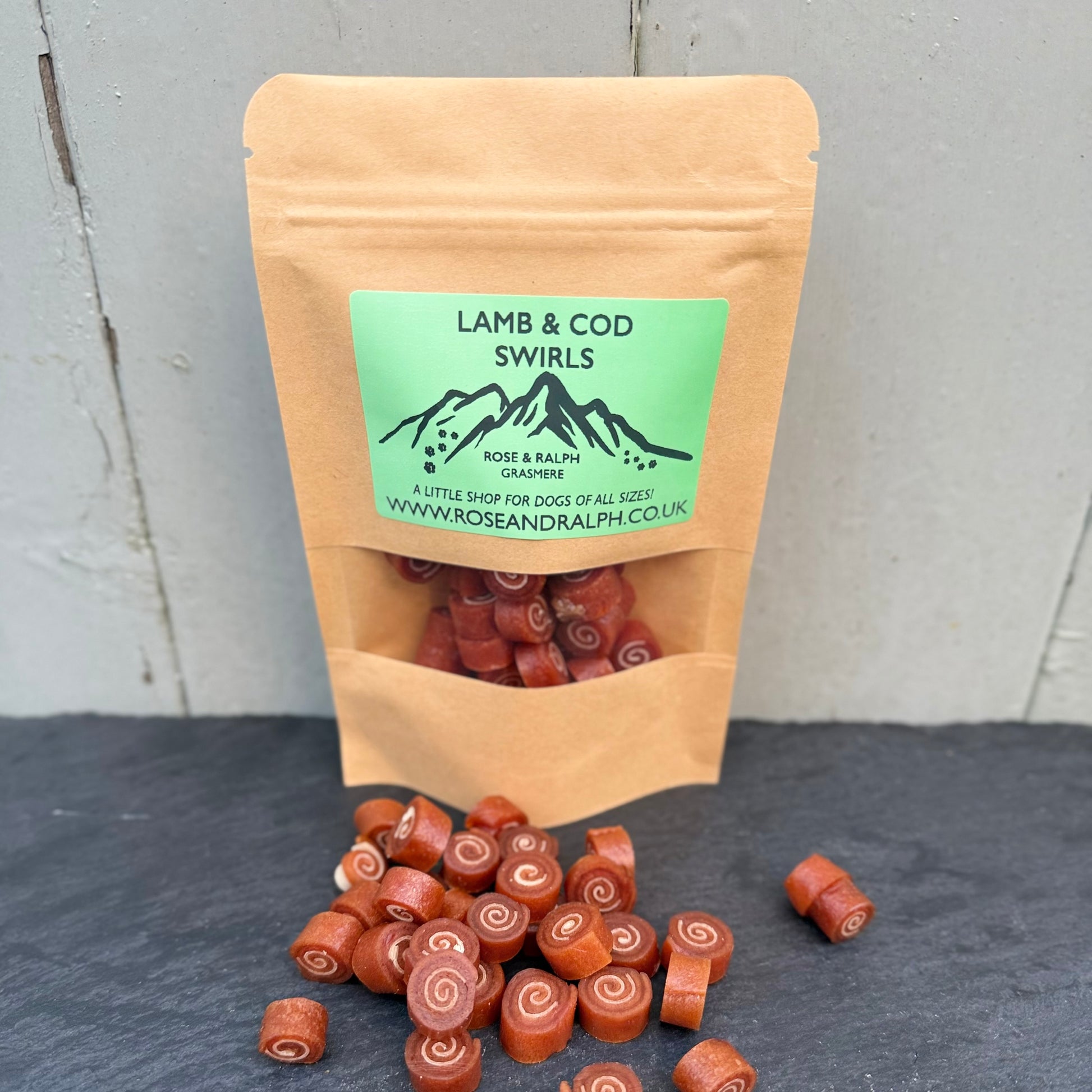 Our Lamb & Cod Swirls are a 100% natural gourmet training treats blending high-quality Lamb with nutritious cod fish—for a balanced surf-and-turf flavour explosion. These bite‑sized spirals are tender, flavourful, and completely free of artificial colours, flavours, or preservatives. They are not only mouth-wateringly tasty but also thoughtfully healthy! Perfect for dogs of all breeds and sizes- especially during training or reward moments- these tiny rolls (about 1 cm long) offer big reward in a little bite!